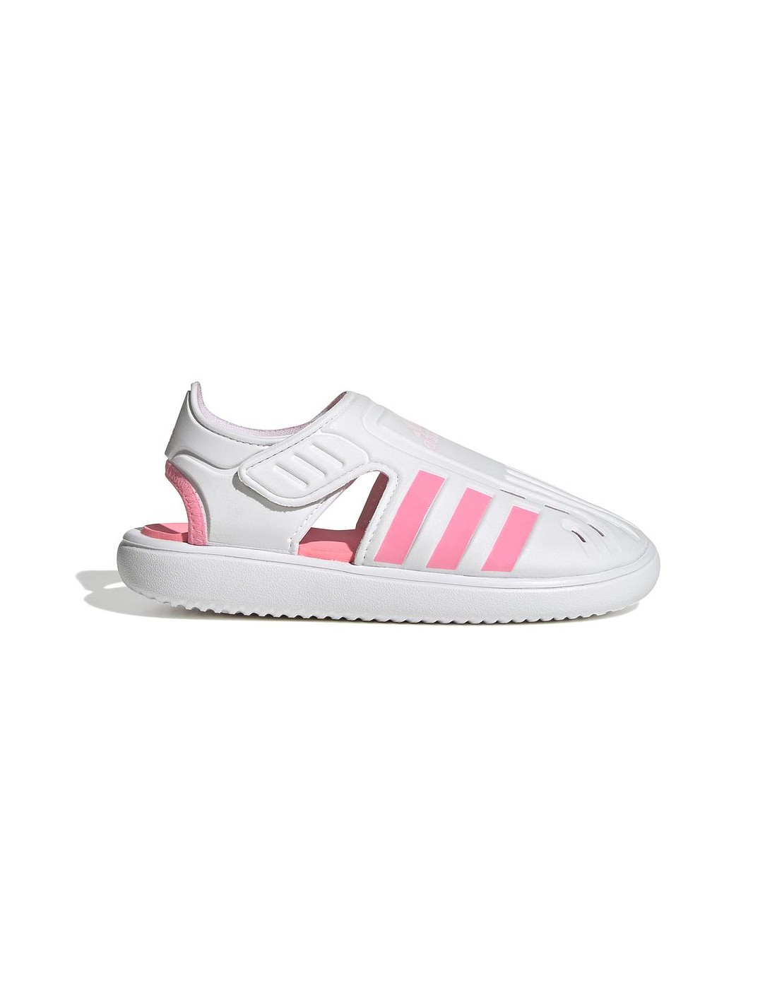 Acampada y piragüismo. Chapoteos y castillos de arena. Exacto, llegan las vacaciones. Esta sandalia Adidas para peques con estilo presenta un cierre con alas de velcro que proporcionan un ajuste seguro incluso cuando los pies están húmedos. La parte superior cerrada cuenta con aberturas que facilitan un secado rápido del pie y protegen los dedos de objetos punzantes.